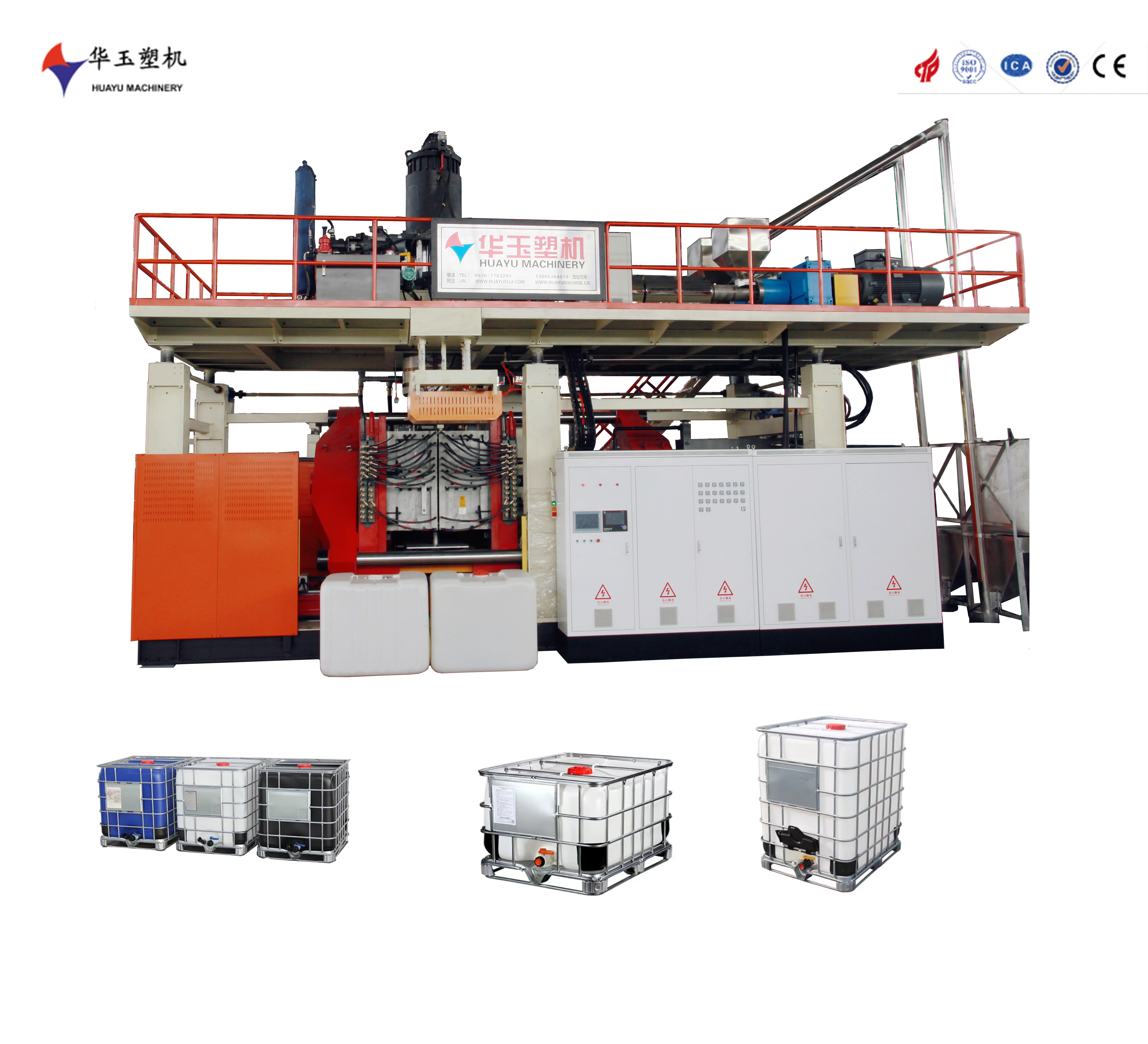 La máquina de moldeo por soplado HUAYU2000L-10L está diseñada para la producción de contenedores de plástico de 10 capas de 2000L con alta eficiencia.garantizar la precisión en cada ciclo de fabricaciónLa construcción robusta garantiza durabilidad y fiabilidad en funcionamiento continuo, por lo que es ideal para la fabricación de grandes contenedores de plástico, tambores y tanques.